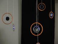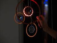 Interactive: Gently touch one of 25 hanging copper “atoms” in this installation to trigger a collision of light.