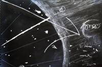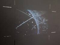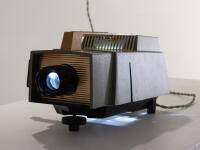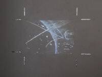 This projector attempts to replicate the experience of spotting a neutrino’s decay on film with a hydrogen bubble chamber. It shows my redrawing of an image once captured at Argonne National Laboratory—the first time a neutrino was captured in a hydrogen bubble chamber, and one of an astonishing quantity (in the hundreds of thousands) made over the course of this neutrino detection experiment.