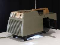 I used a period-appropriate projector and converted its original halogen bulb (lifetime 20 hours) to a (dim, low-heat) LED light engine.