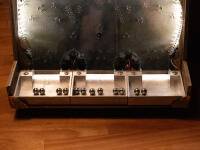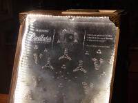This machine is new construction, made with Baltic birch plywood, one-way acrylic, and 3D-printed PLA post-processed with stains and waxes. I used a laser cutter to engrave the artwork, layering paint before and after. It contains hundreds of nails.
