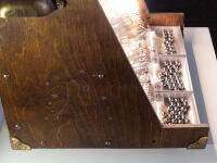 Interactive: Select a “sphærical Fermion” (steel ball bearing) and gently insert it into the top slot of this machine; as soon as it enters the machine, the front glass becomes a blank mirror. You’re not allowed to see the ball’s progress downwards. It emerges into one of three trays at the bottom of “The Astonishing Oscillator.”