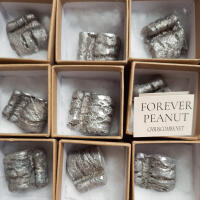These aluminum peanuts are each unique and sold singly in a small gift box. It will be similar to the one shown here, but not exactly the same. I individually quality-control and hand-finish each peanut, which has a small, shiny metal side (deburred; no sharp edges) where the peanut was attached to a sprue during the casting process.