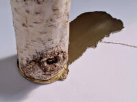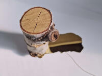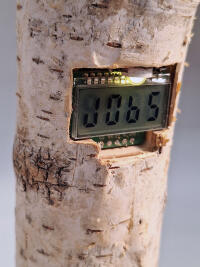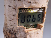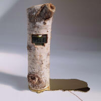 The display is embedded in a small birch branch, anchored with a highly polished brass foot. A small warm LED illuminates the screen. The story takes about six minutes to read, and loops continuously.